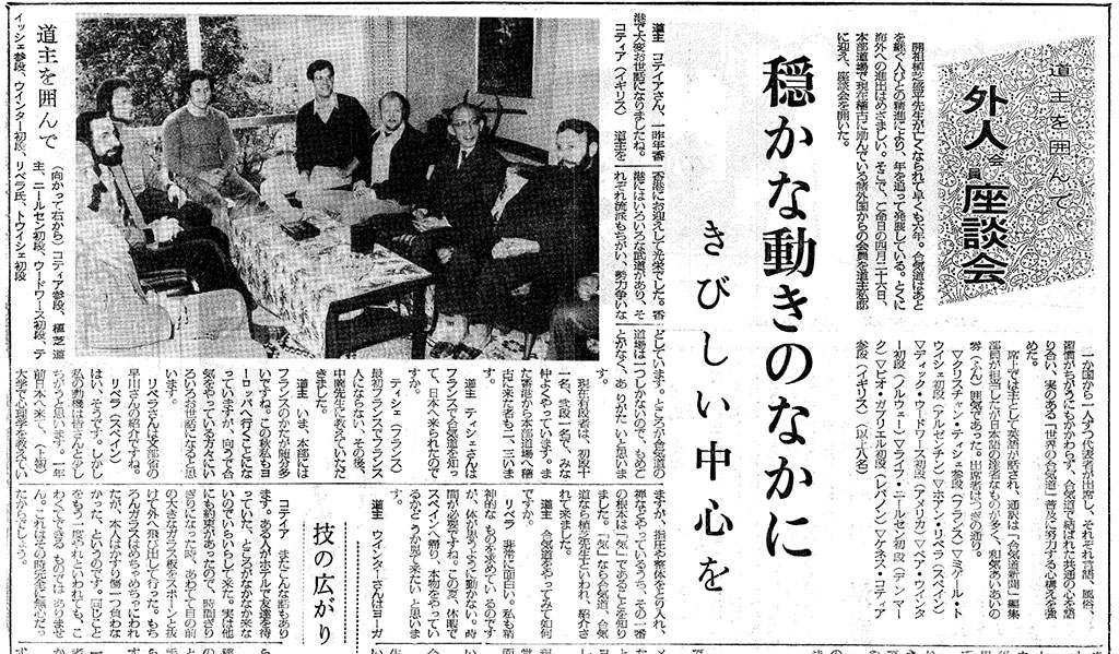Report on a roundtable discussion that took place in May 1975 at Doshu’s house with foreign aikidoka. From left: Miguel Carlos Teuscher, Juan M. Rivera, Per Winter, Christian Tissier, Richard H. Woodworth, Leif Lyngard Nielsen, Doshu, Ken Cottier, Bio Gabriel (not visible).