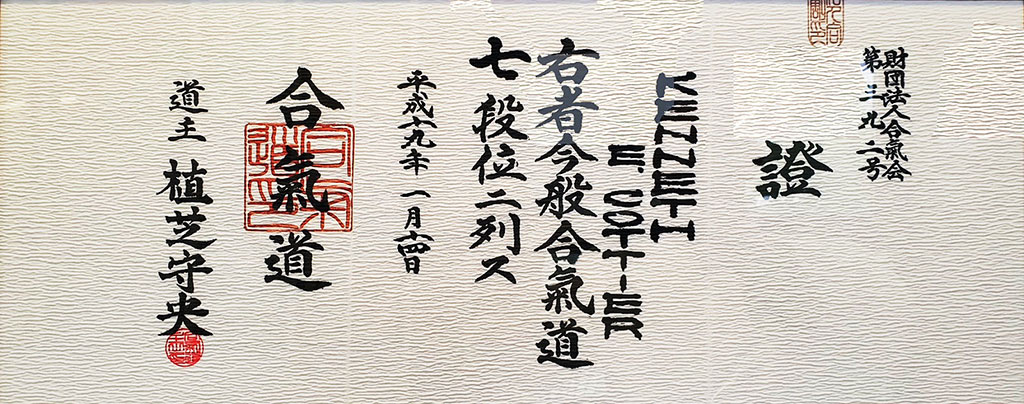 Ken Cottier’s 7th dan certificate, which bears the number 392.