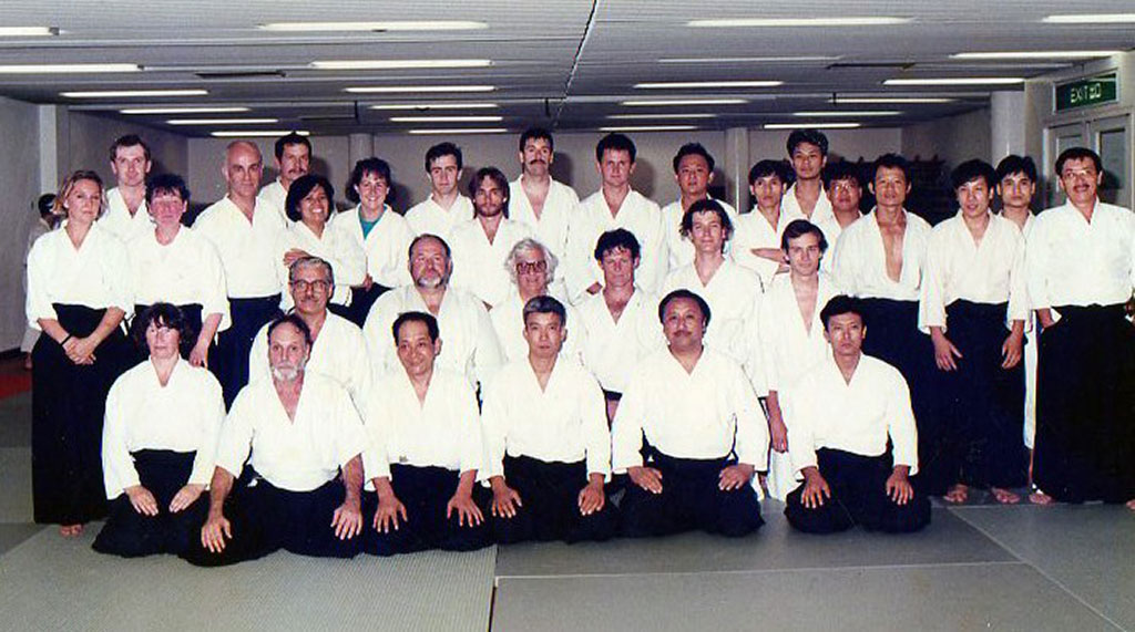 20th Anniversary of Hong Kong Aikido Association in 1991. Front row, second from left: Ken Cottier, Paul Lee, Ueshiba Moriteru, Fujita Masatake, and Kanazawa Takeshi.