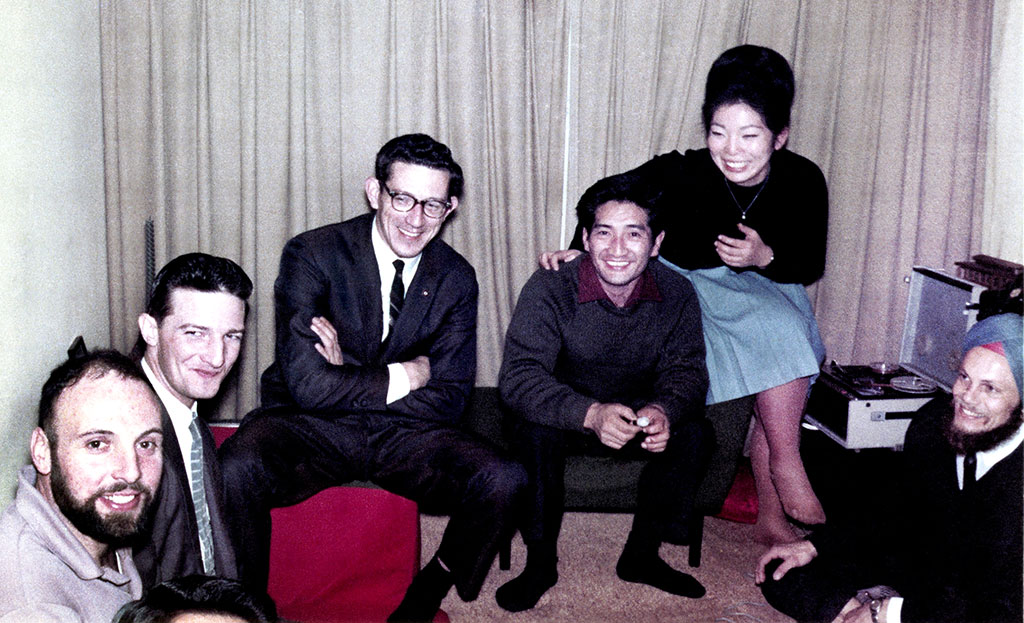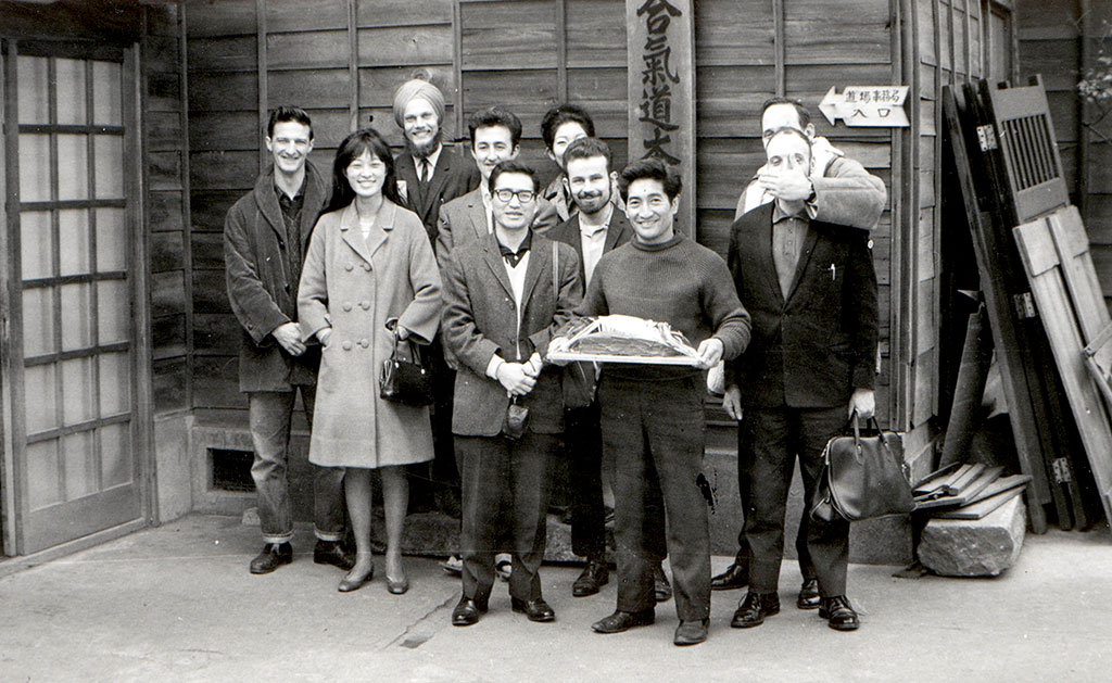 O Sensei surrounded by the group of foreign students. From left to right: Alan Ruddock, Henry Kono, Per Winter, Joanne Willard, Joe Deisher, O Sensei, Joanne Shimamoto, Kenneth Cottier, a visitor from the USA, Norman Miles and Terry Dobson (photo taken by Georges Willard with Henry Kono's camera).