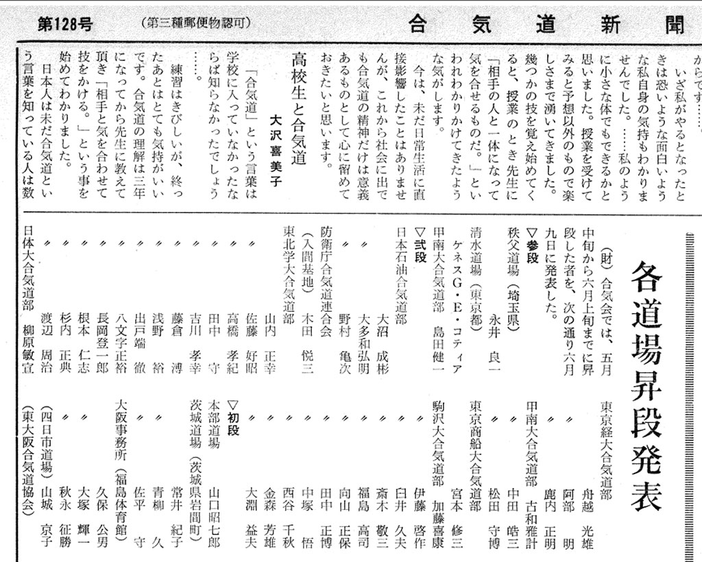 December 1965 issue of the Aikido Shinbun showing the list of promotees. Cottier is listed as shodan.