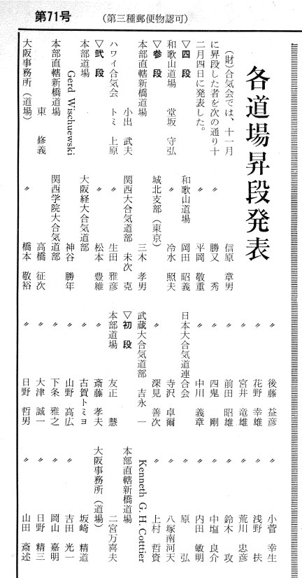June 1971 issue of the Aikido Shinbun showing Cottier’s promotion to sandan.