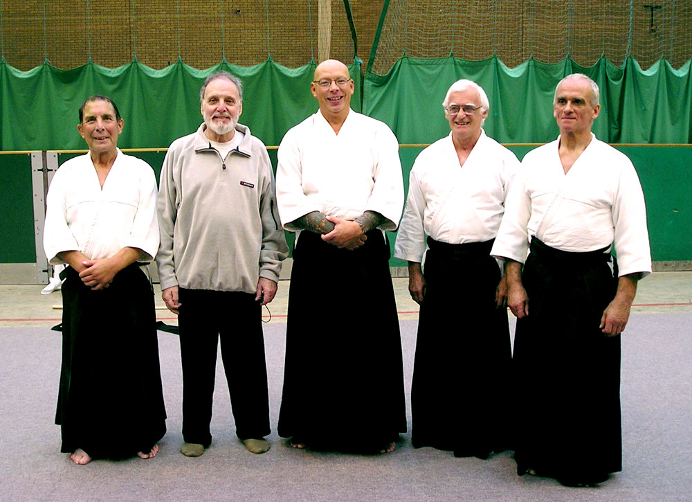 25th anniversary of the White Rose Aikikai, headed by Shane Riley, in the center surrounded from left to right by British Aikido pioneers William Smith, Ken Cottier, Terry Bayliss, and Terry Ezra. Cottier was recovering from a knee replacement surgery and could not practice on that day.