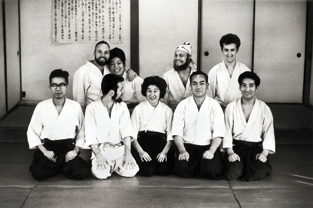 Group shot from Tohei Sensei’s class in Iidabashi Dojo (Front row: Second from the left, Joe Deisher, fourth and fifth from the left, Tohei Koichi and Henry Kono. Back row: From the left, Ken Cottier, Joanne Shimamoto, Per Winter, and Alan Ruddock).