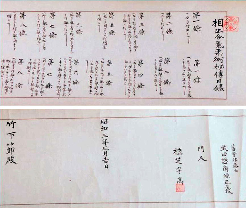 The following document recently circulated by Chris Li confirms this, as it is the actual Aioi Aiki-jujutsu Hiden Mokuroku (相生合気柔術秘伝目録) certificate awarded by Ueshiba Morihei to Takeshita SetsuTakeshita Setsu (竹下 節), the second daughter of Admiral Takeshita IsamuTakeshita Isamu (竹下 勇, 1870 - 1949) was an admiral in the Imperial Japanese Navy. He was also a diplomat who helped end the Russo-Japanese War. Passionate practitioner of Japanese martial arts, he was particularly supportive of the development of judo, sumo and aikido. in 1928.