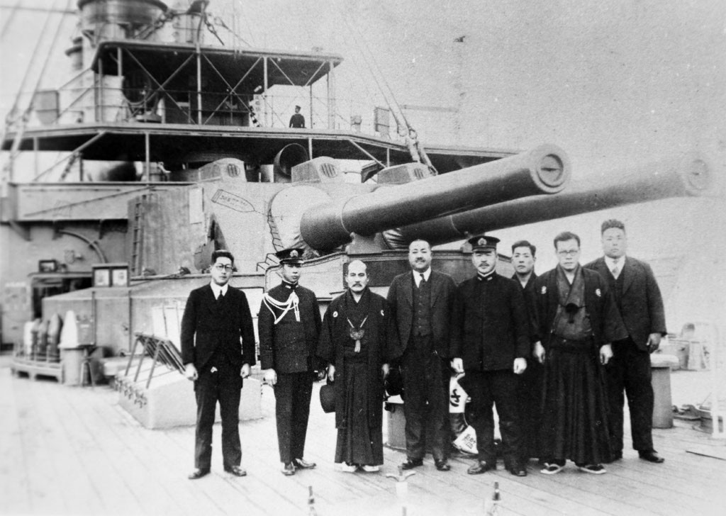 Morihei Ueshiba on board of the warship Mikasa (三笠) c. 1940.