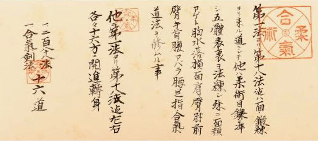 Section enumerating several groups of techniques, including the series of 18 explained previously, a mention of a repertoire of 218 techniques (instead of the 118 usual techniques of hiden mokuroku of Daito-ryu), and aiki-kenpo techniques (合気 剣法). There is also the term aiki-doho (合気 道法), which does not necessarily mean that Morihei used the term aikido before it was officially registered with Dai Nippon Butokukai in 1942, but which rather means something like "the way of enlightenment through aiki".