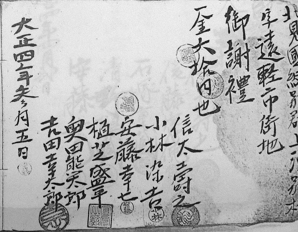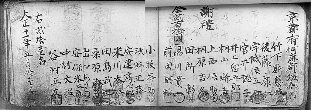 Another marker of the value of money in Takeda Sokaku’s and Ueshiba Morihei’s eyes is seminar fees. Here, below, are two shareiroku: enrollment sheets of seminars presented by Takeda Sokaku. The one on the top enumerates six people (including Ueshiba Morihei) for a total price of 60 yen, and the one on the bottom enumerates 21 people for 210 yenMy thanks again to Josh Gold, Guillaume Erard and Christopher Li..