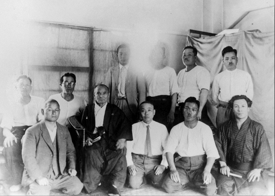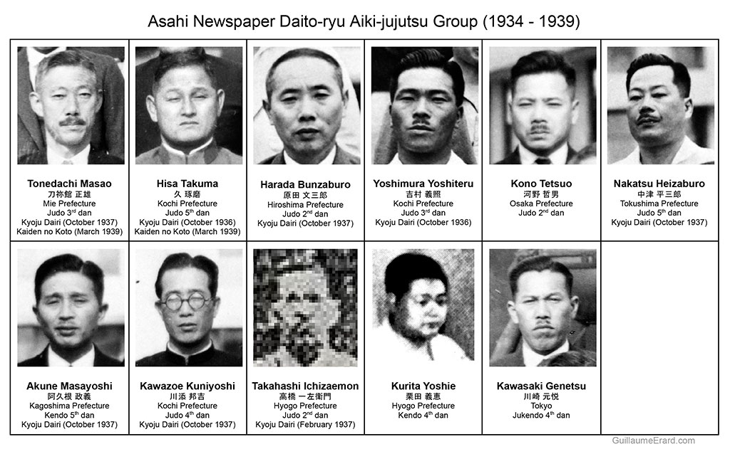 - The group as the Asahi Newspaper dojo. At the front, left to righ: Kawasaki Genetsu, Hisa Takuma, Kawazoe Kuniyoshi, Takeda Sokaku, Harada Bunzaburo, Yoshimura Yoshiteru, unknown. Standing at the back: Takeda Tokimune, Akune Masayoshi, Nakatsu Heizaburo, Kono Tetsuo.