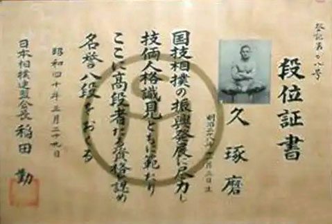 Hisa Takuma's eighth dan sumo certificate issued by the Japanese Sumo Federation and dated March 29, 1965.