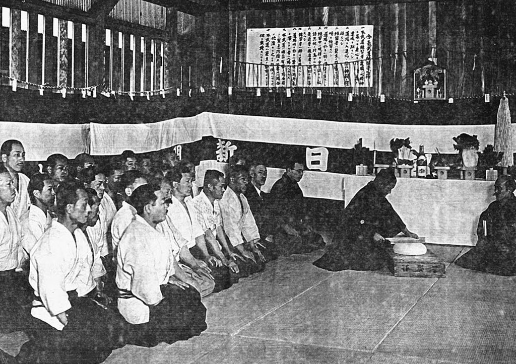 I have written previously about the complicated situation between Ueshiba and his teacher, Takeda Sokaku, and the ways this influenced the naming of his art. When he was prompted to ascribe a name to his martial art, it seems that Morihei argued that since they were practicing at the Asahi Journal (朝日新聞), the art could be called “Asahi-ryu” (朝日流). Faced with criticism at his use of the journal’s name for a martial art, Ueshiba changed the asahi character to 旭流. Interestingly, both characters mean “rising sun”, which fit the training schedule rather well. That being said, on the picture of the Kagamibiraki ceremony taken around 1934, the name displayed on the board at the back shows clearly "Aikibudo" (合気武道).