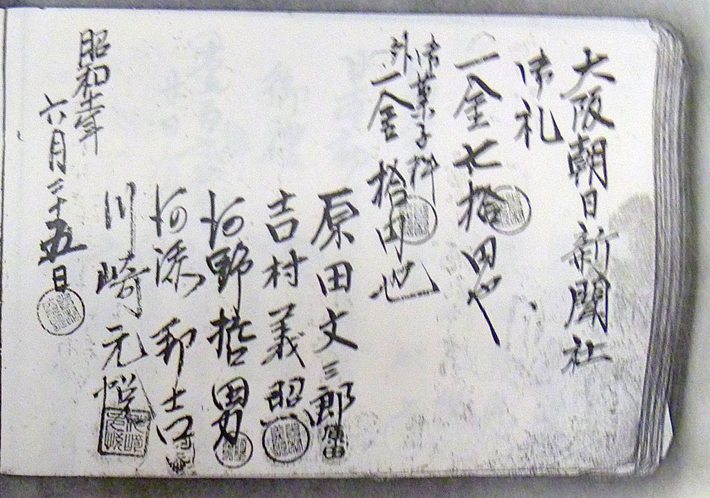 Shareiroku entry dated June 25, 1936, showing that a payment was made at the Asahi Newspaper for classes attended by Harada Bunzaburo, Yoshimura Yoshiteru, Kono Tetsuo, Kawazoe Kuniyoshi, and Kawasaki Genetsu