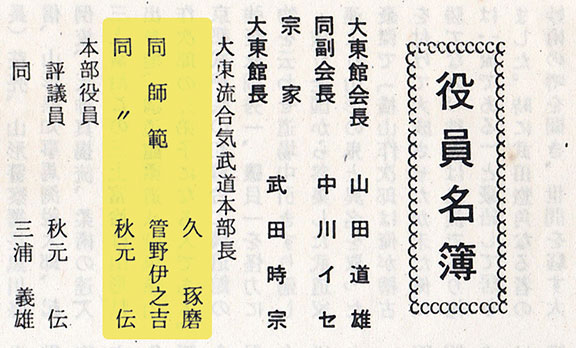 List of officers of the Daitokan (as of August 1st, 1973). Takeda Tokimune is listed as Soke and Hisa Takuma as Director of the Daito-ryu Aiki-budo Headquarters. [Reproduced with permission from Marc Trudel's blog]
