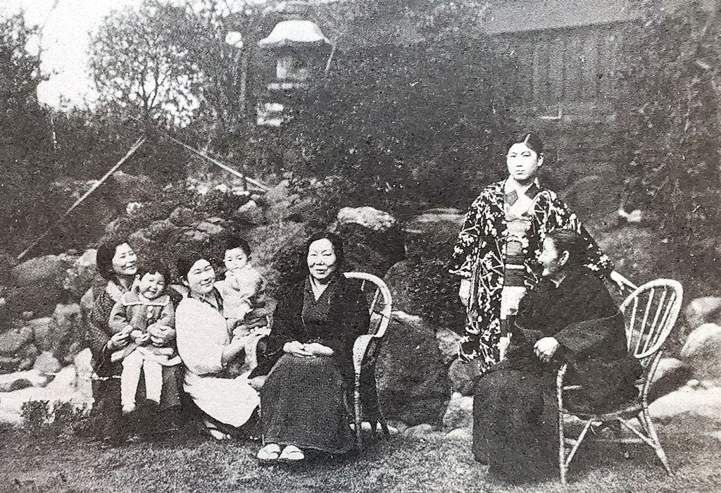 Garden of the Umeda Manor. Ueshiba Hatsu is sitting at the center. On the far right is Hisa's mother, Ushi. Hisa's elder sister is on the far left. The child on the left is Hisa's third daughter, Kyoko and the one on the right is his fourth daughter, Asako.