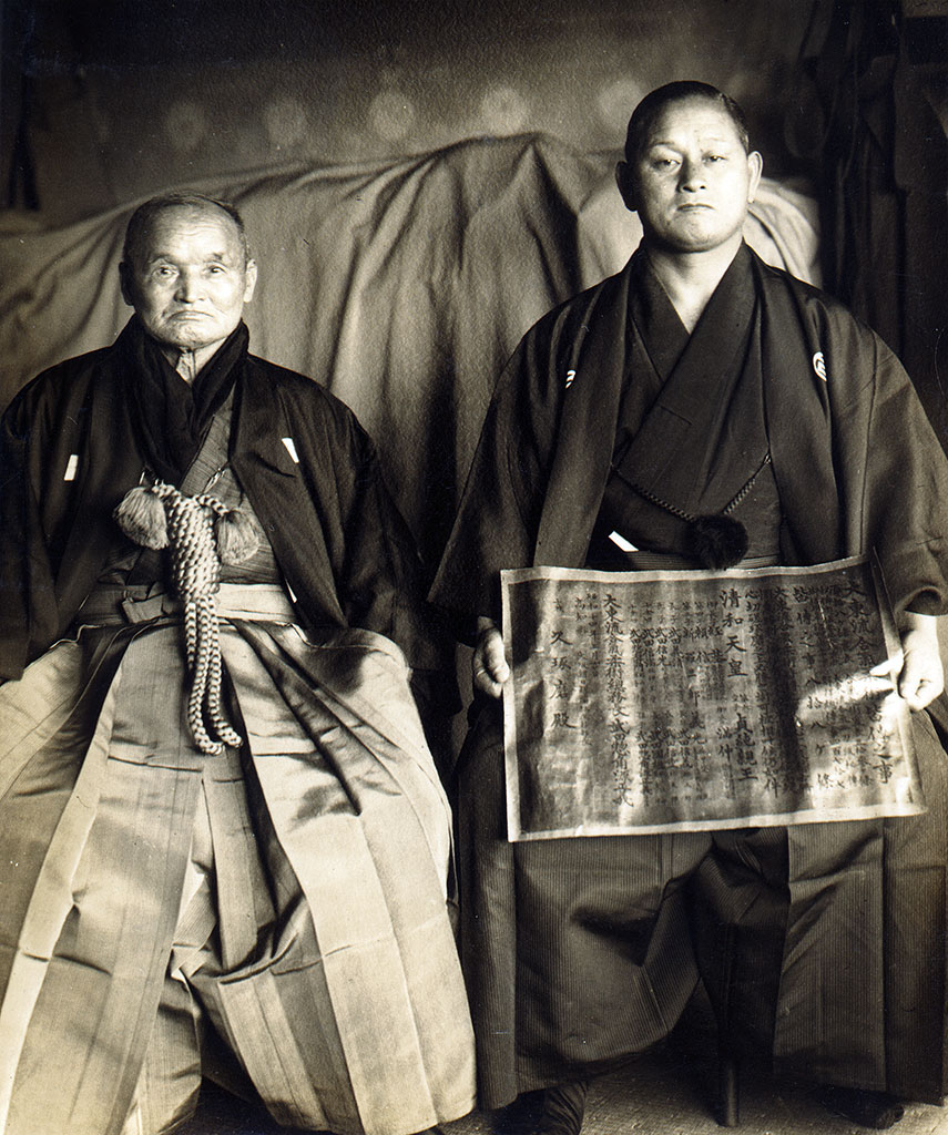 Formal photo of Takeda Sokaku and Hisa Takuma taken at the Asahi Journal. Hisa is holding his kaiden no koto (皆傳之事) certificate, which is dated from March 1939. The picture itself was taken two months after the certificate had been awarded. Note the shiny aspect of the paper, which is likely to be golden paper. The white border could be the canvas it was laid on.