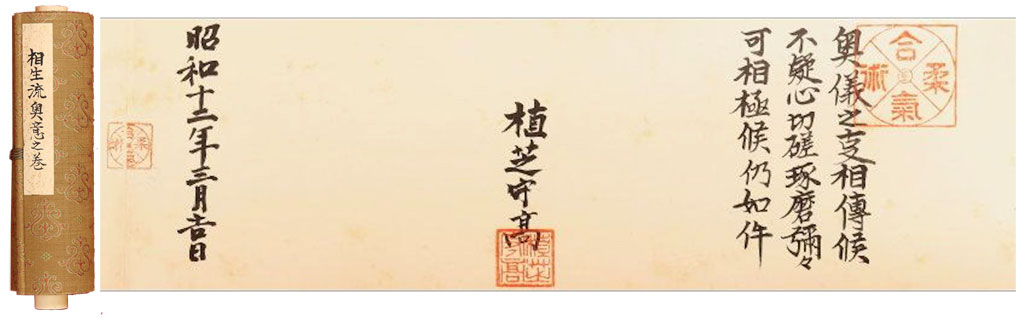 This document is interesting in many ways. First of all, the scroll is dated March 1937, one year after the arrival of Takeda Sokaku, which therefore confirms that Ueshiba Morihei maintained some activity in Osaka while Takeda was present, and which once again seriously undermines the hypothesis of the sudden escape, never to return.