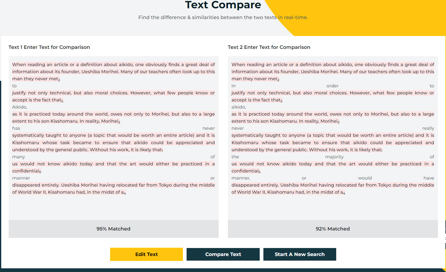 Result of comparison check on a sample page. It shows that for the sample I ran, there was a 95% word-for-word match between the content of the book and my article.