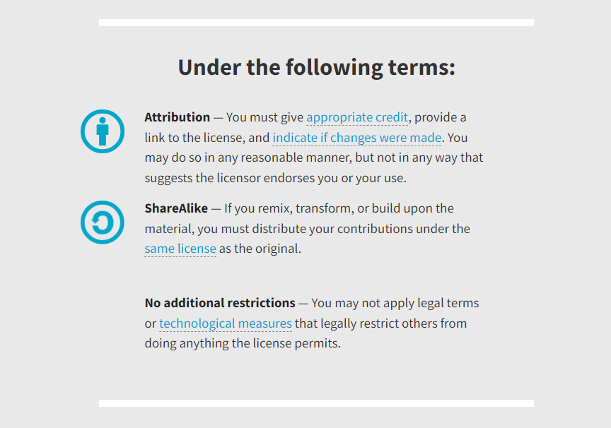 Summary of the Attribution-ShareAlike 4.0 International (CC BY-SA 4.0) as stated on creativecommons.org