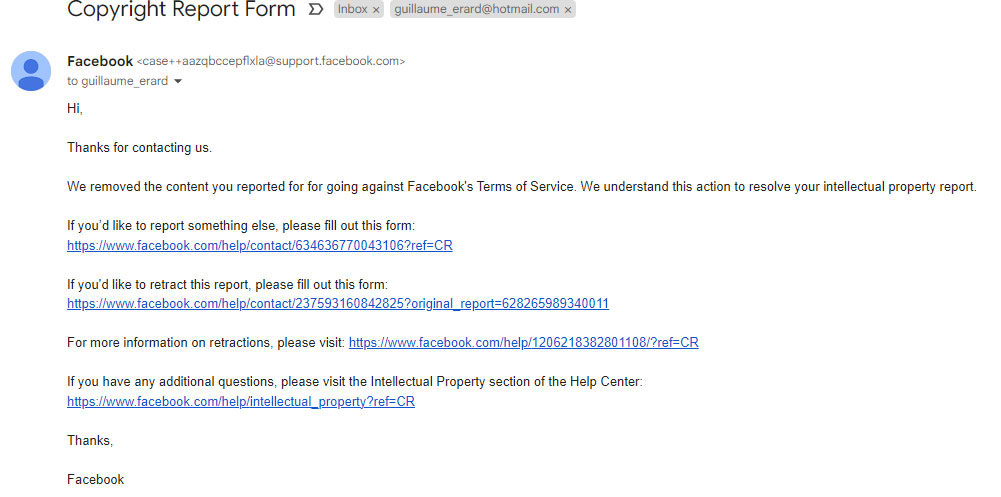 Several months ago, I commented on some of the posts on the Facebook page to object to this illegal use of my content but the administrators of the page deleted my message. I therefore issued complaints directly towards Facebook, who assessed that the content was indeed infringing my copyright and they took it down. Unfortunately, even though this led to the taking down of numerous posts, Facebook did not seem to have taken disciplinary action against the page itself.
