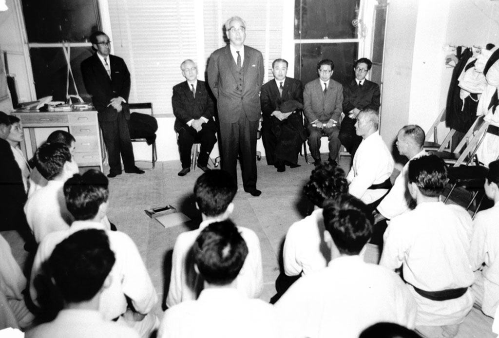 Ishii Mitsujiro giving a speech at Hisa's Kansai Aikido Club in 1962. Hisa is kneeling on his left. Also present are Former Minister of Education, Culture, Sports, Science and Technology Sakata Michita (坂田 道太) and Minister of Health and Welfare, Hasegawa Takeshi (長谷 川峻). [Image kindly provided by Aikido Journal]